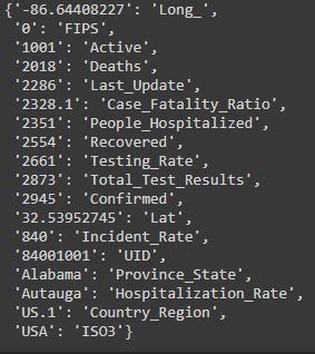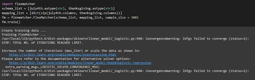 When we trained the schema matcher we ran into a problem where flexmatcher doesn't like dealing with numbers as it applies the .lower() function at some point in the method. As such we had to turn the attributes into strings using the .astype(str) function. After this it ran with lots of warnings but still returned some results. We also had to change the version of pandas to 0.25.1 because FlexMatcher uses the ix method from a previous version of pandas. The schema list had the dataframes for daily covid cases from July 11th and December 2nd. We then got the dictionary of those dataframes to put in the mapping list, and then we put them into the FlexMatcher method with parameter sample size set to 500 to train our schema matcher. The code and the results are shown below.