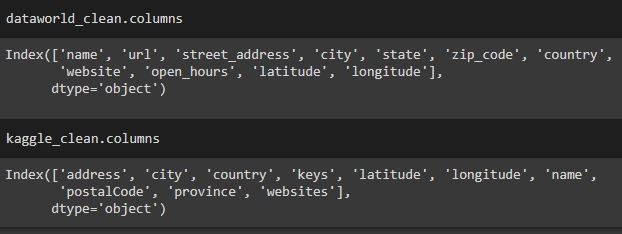 Comparing the column names some are the same such as name, city, latitude, and longitude, totaling to 4. That leaves 7 attributes that are different for dataworld and 6 for kaggle. Some of the names are completely different from their counterparts such as state in the kaggle dataframe compared to province from the kaggle dataframe. Therefore we decided to use instance-based matching for the jaccard.