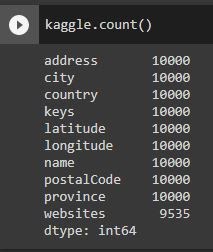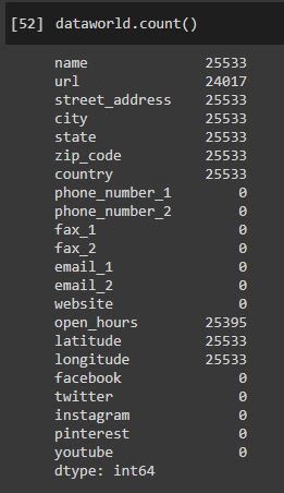 As you can see from the number of records compared to the count of non-missing values, the dataworld dataframe, the url, phone_number, fax, email, website, facebook, twitter, instagram, pinterest, and youtube values all have missing values. Some of these attributes had all missing values, so we decided to remove them. We did not remove the column website because we thought it would be interesting to have later on for the jaccard similarity matching. We removed 12 attributes in total.