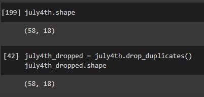 The time series data had 3339 records, and 330 attributes. The July 11th data had 58 records and 18 attributes. The Dec 2nd data had the same number of records and attributes compared to the July 11th dataset. There were also no duplicates after dropping the duplicates using the drop_duplicates function. We show this using the number of records before the drop and after the drop. Looking below you can see that they are the same.