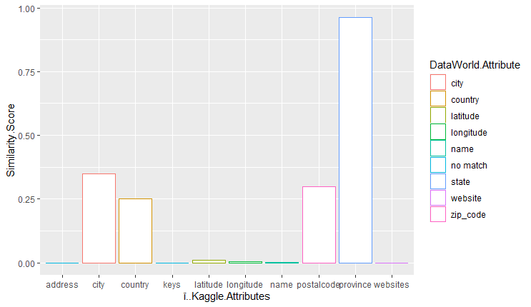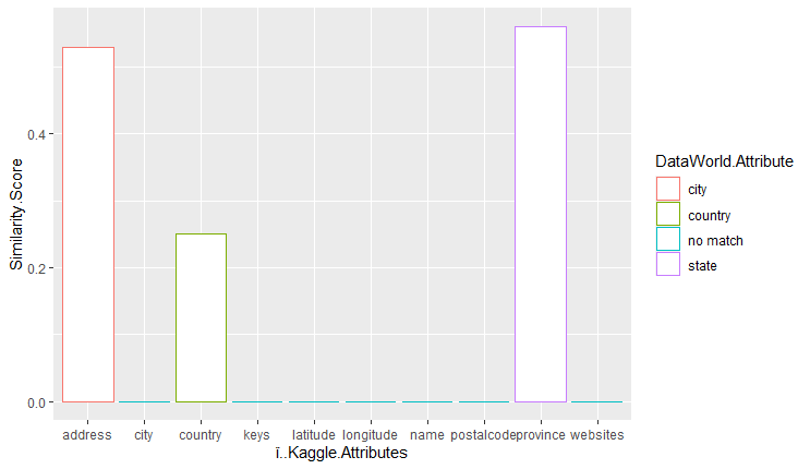 The results of the attributes of the kaggle dataframe vs the similarity score are shown below. These charts were generated by ggplot in R. The highest similarity score result with the attribute from the dataworld dataset is encoded using color. Note that even if the bar is almost negligible it is not 0 if the color is not encoded to 'no match' in the color legend.
