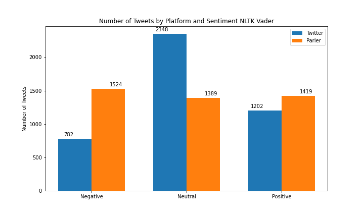 When comparing the NLTK Vader sentiment vs the TextBlob sentiment tools there was a major difference in results. Referring to figure (blah) the NLTK sentiment results were more evenly distributed across the three classes of sentiment than TextBlob with counts being 782 negative, 2348 neutral, and 1202 positive posts for Twitter, and 1524 negative, 1389 neutral, and 1419 positive for Parler. In the TextBlob sentiment results we observed that a large number of the posts were classified as neutral for both Twitter and Parler, with counts being 256 negative, 3334 neutral, and 256 positive for Twitter, and 152 negative, 3253 neutral, and 927 positive for Parler.