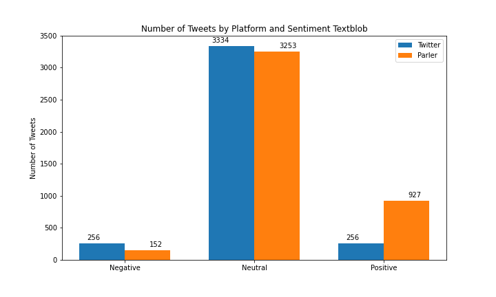 Parler and Twitter posts for NLTK sentiment Twitter had a higher number of neutral posts (2348 Twitter posts vs 1389 Parler posts), however Parler had a higher number of negative posts (1202 Twitter posts vs 1419 Parler posts). For TextBlob sentiment Parler posts contained more positive posts, (256 Twitter posts vs 927 Parler posts) and the number of posts between platforms were similar for neutral and negative. (3334 Twitter posts vs 2523 Parler posts and 256 Twitter posts vs 152 Parler posts respectively)