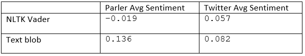 While our hypothesis that the distribution of posts would be more negative for Parler appears to hold true for the results from the NLTK Vader sentiment, the same cannot be said for TextBlob. Furthermore looking at average sentiment values for negative posts