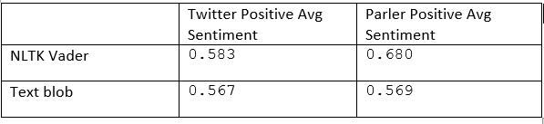 Comparing the average sentiment scores for positive sentiment between Twitter and Parler from (figure) we observe that for NLTK Vader Twitter is less positive on average than Parler (0.583 vs 0.680). The same occurs for TextBlob, but the difference is not nearly as significant. (0.567 vs 0.569) All values fall within the positive band for sentiment scores.